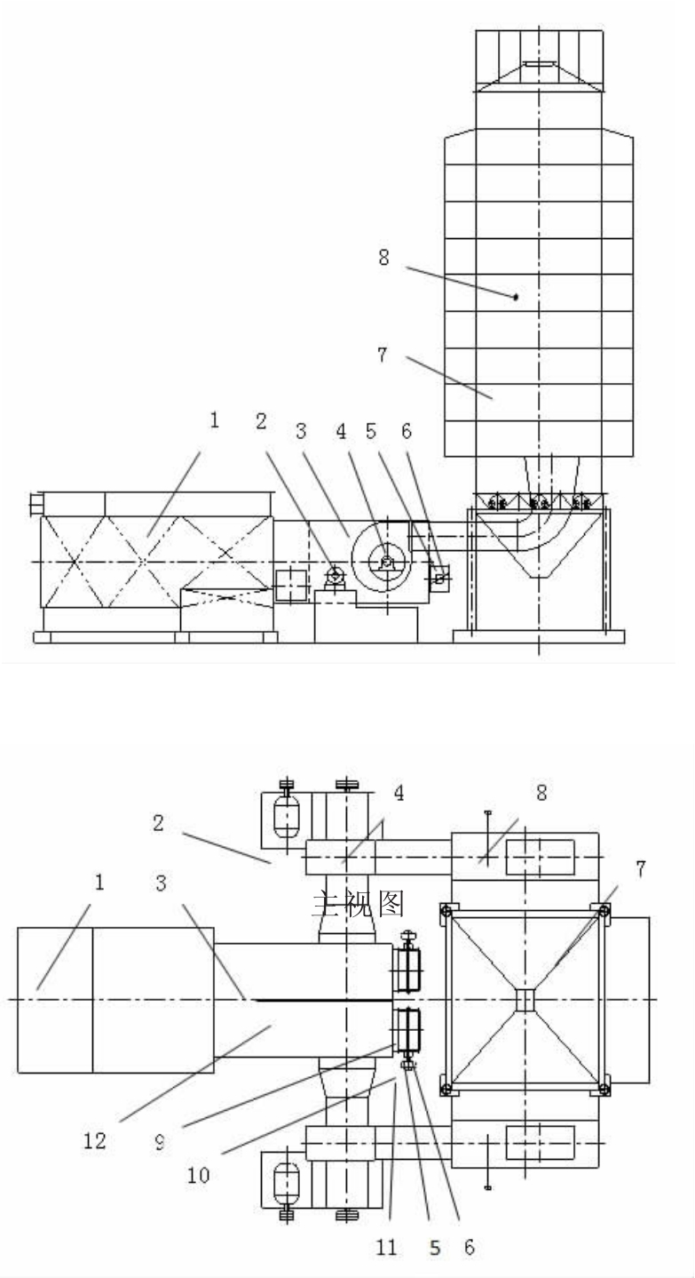 1.熱交換器;2.電機;3.混合室;4.主風機;5.調風筒;6.風門板;7.種子幹燥機;8.溫度傳感器;9.閥門軸;10.聯軸器;11.電動執行器;俯12視.混圖合室中間隔板